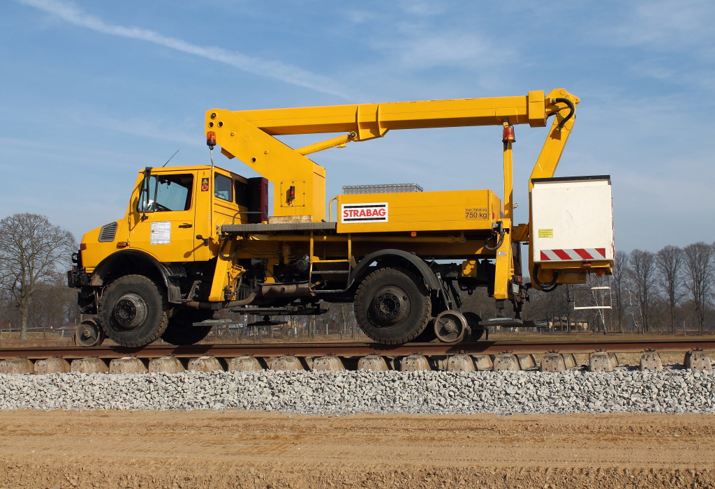 Zwei-Wege-Unimog mit Hebebühne der Fa. Strabag wird für Fahrleitungmontage eingesetzt. Beim Warten auf weiteren Einsatz am 06.03.2013 in Nassenheide. (zum Bild)