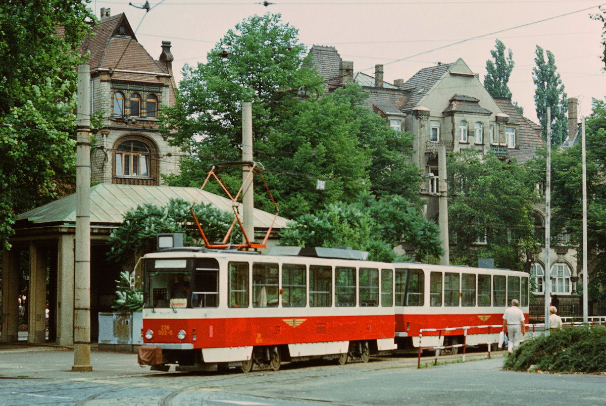 Diesen TATRA-Straßenbahnzug vom Typ T6A2 Nr.226 002 mit Beiwagen 276 xxx habe ich während der Erprobung in Dresden nur dieses einzige Mal vor die Linse bekommen. Hier, am Endpunkt in Plauen, Nöthitzer Straße, legt er im Mai 1986 gerade eine kurze Pause ein. Er ist in Dresden nicht im Linienverkehr eingesetzt worden. Nach der Karriere bei der Stadtrundfahrt wurde er 2000 abgestellt und 2002 verschrottet. (zum Bild)