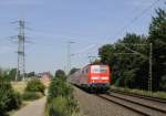 145 100-4D-XRAIL(Cross Rail)zieht einen Containerzug durch das Wurmtal auf der KBS 485, in Richtung Mönchengladbach mitgezogen am 27.6.2015 (zum Bild)