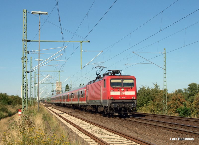 112 172-2 beschleunigt am 19.08.09 die RB 21325 Bad Oldesloe - Hamburg Hbf beim passieren der südlichen Bahnhofsausfahrt von Bad Oldesloe. Nächster Halt wird Kupfermühle sein. (zum Bild)