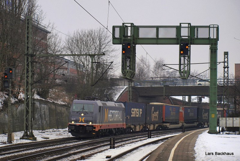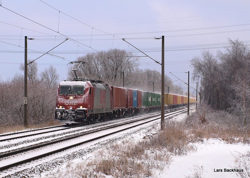 Mein 1300. Bild bei BB.de! Zusehen ist die leicht mit Schneebedeckte 186 133-5 der OHE, die am 3.01.10 einen recht langen Containerzug aus Hamburg-Waltershof durch Hamburg-Moorburg Richtung Süden bringt. (zum Bild)