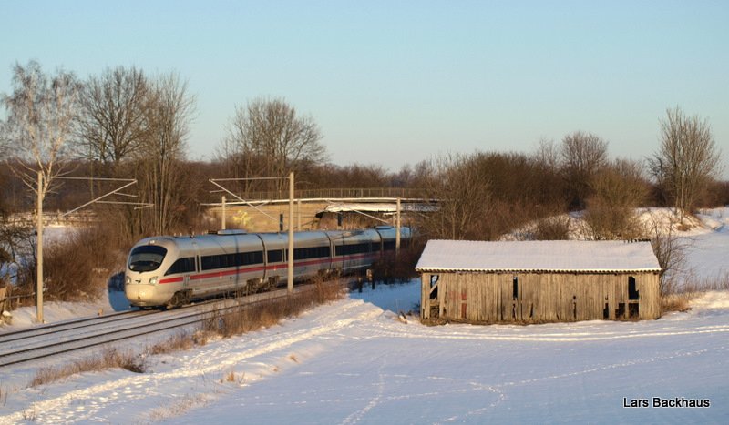 Bei tiefstehender, winterlicher Nachmittagssonne des 27.01.10 fährt ICE 36 von Kopenhagen nach Hamburg Hbf durch das beschauliche Dörfchen Altenfelde kurz vor Reinfeld (Holst.). Rechts daneben steht ein brachliegender Unterstand. (zum Bild)