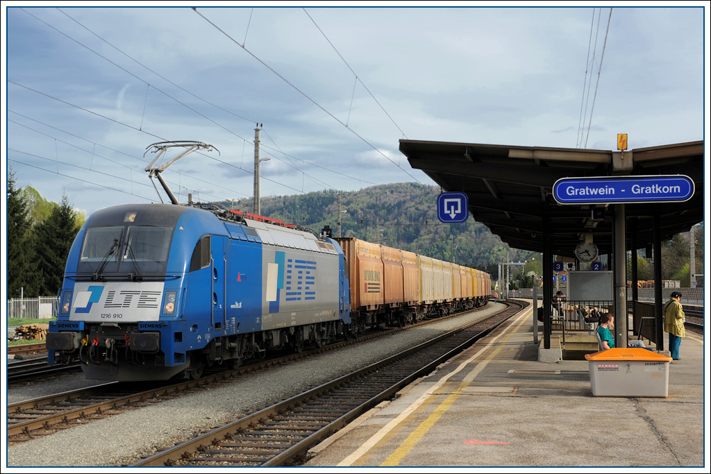 1216.910 mit dem LTE Leerhackschnitzelzug 41385 am 8.4.2011 kurz vor der Abfahrt in Gratwein-Gratkorn Richtung ungar. Grenzbahnhof Hegyeshalom. (alla foto)