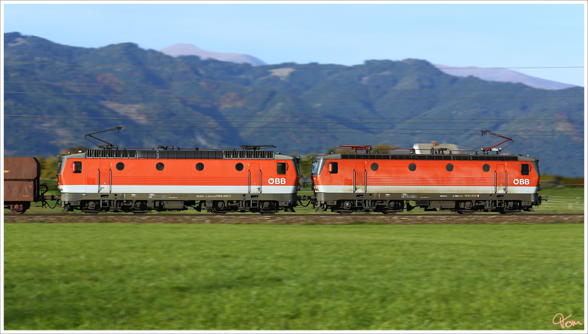 Mitzieher von den beiden E-Loks 1144 053 + 1144 241, welche einen Erzumleiter durch das Aichfeld ziehen. Zeltweg 10_2013 (zum Bild)