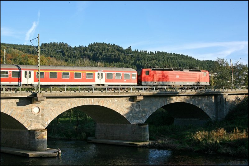 Während der Angler sich um seine Fische kümmert, überquert die 143 214 mit der RB91 (RB 39175) "Ruhr-Sieg-Bahn" bei Finnentrop die Lenne Richtung Siegen. (13.10.2007) (zum Bild)