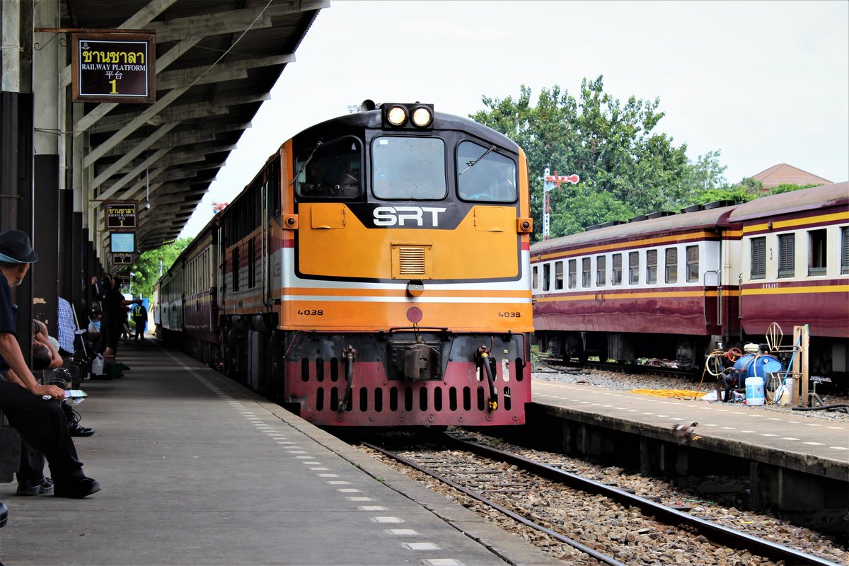 SRT GEK 4038 kommt im Bild mit einem Schnellzug auf Gleis 1 im Bahnhof Thon Buri an. Freitag, 4. August 2017 (do obrazu)