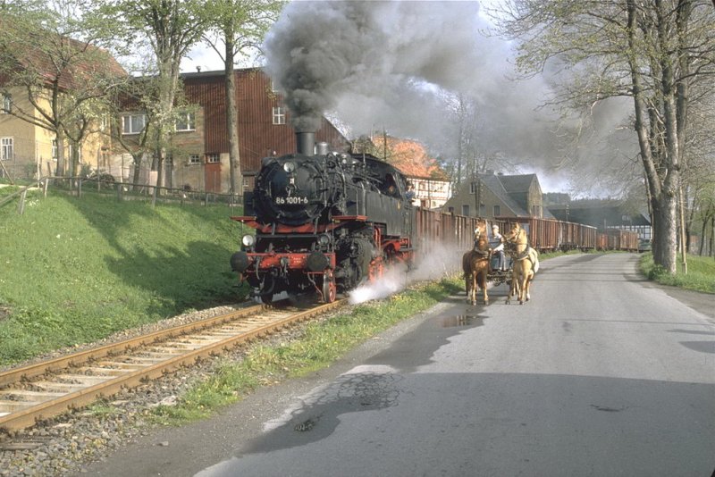 Nebenbahnromantik pur. Ein herrliches Zeitdokument. Das Schlitzohr von einem Lokführer hat vermutlich absichtlich noch etwas Dampf abgelassen, um die Pferde zu erschrecken.