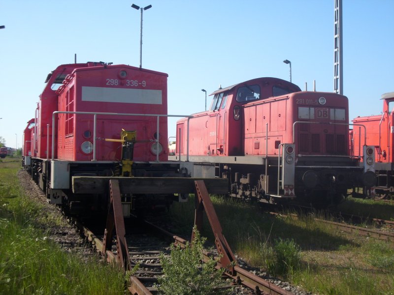 Lok 298 336 und 291 011 stehen am 22.05.2008 in der Einsatzstelle Mukran abgestellt. (zum Bild)