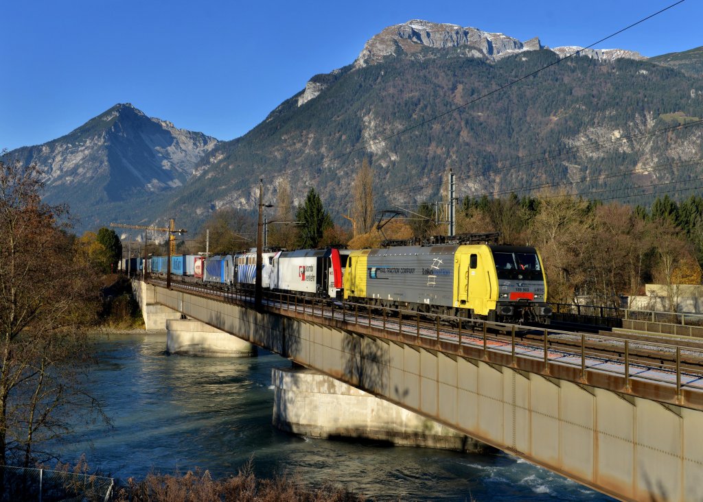 189 903 + 185 665 + 139 177 + 186 102 mit einem KLV am 17.11.2012 bei der Überquerung des Inns in Brixlegg. (zum Bild)
