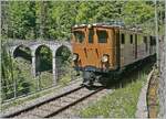 Die RhB Bernina Bahn Ge 4/4 81 der Blonay-Chamby Bahn hat den Baye de Clarens Viadukt verlassen und nimmt nun bei Vers chez Robert die Steigung nach Chamby in Angriff. 23. Mai 2021 (zum Bild)