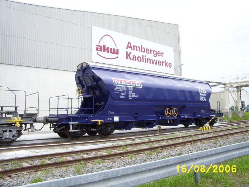 Ein blauer Güterwagen von Nacco am 16.8.2006 vor dem akw in Hirschau. (zum Bild)