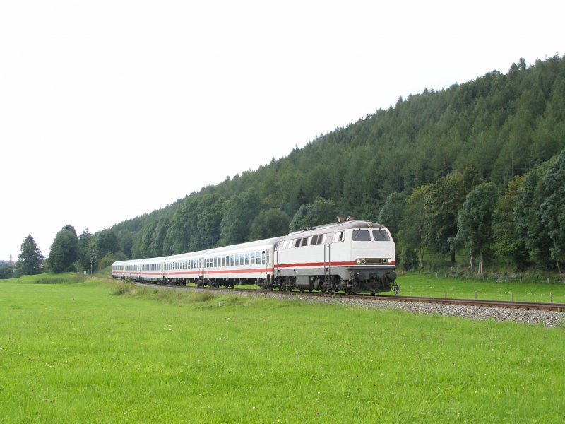 Endlich Schluss mit dem Verkehrsroten 218nern vor Intercitys! Ein zweites mal kam die Idee eine 218 zu Modernisieren. Durch den neuen Motor ist es nun auch möglich die Lüftungsschlietze an der Seitenwand zu entfernen. 218 999 noch ohne Nummer und Logo während Erprobungsfahrten in Altstätten im Sommer 07. (zum Bild)