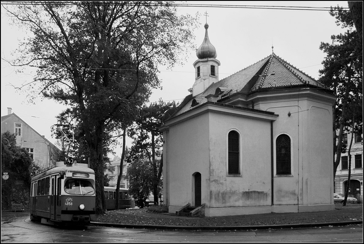 S/W passt hier nicht nur gut, sondern gefällt mir besser als ein "buntes" Bild, da es die Kapelle und nicht die Strassenbahn in den Vordergrund rückt.