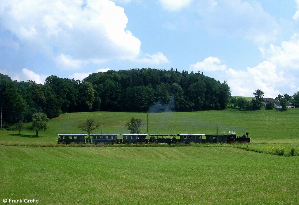 ÖGEG 298.52 mit Personenzug nach Grünburg, Steyrtalbahn Steyr Lokalbahnhof - Grünburg, 760 mm Spurweite, fotografiert bei Aschach an der Steyr am 09.07.2006 (do obrazu)