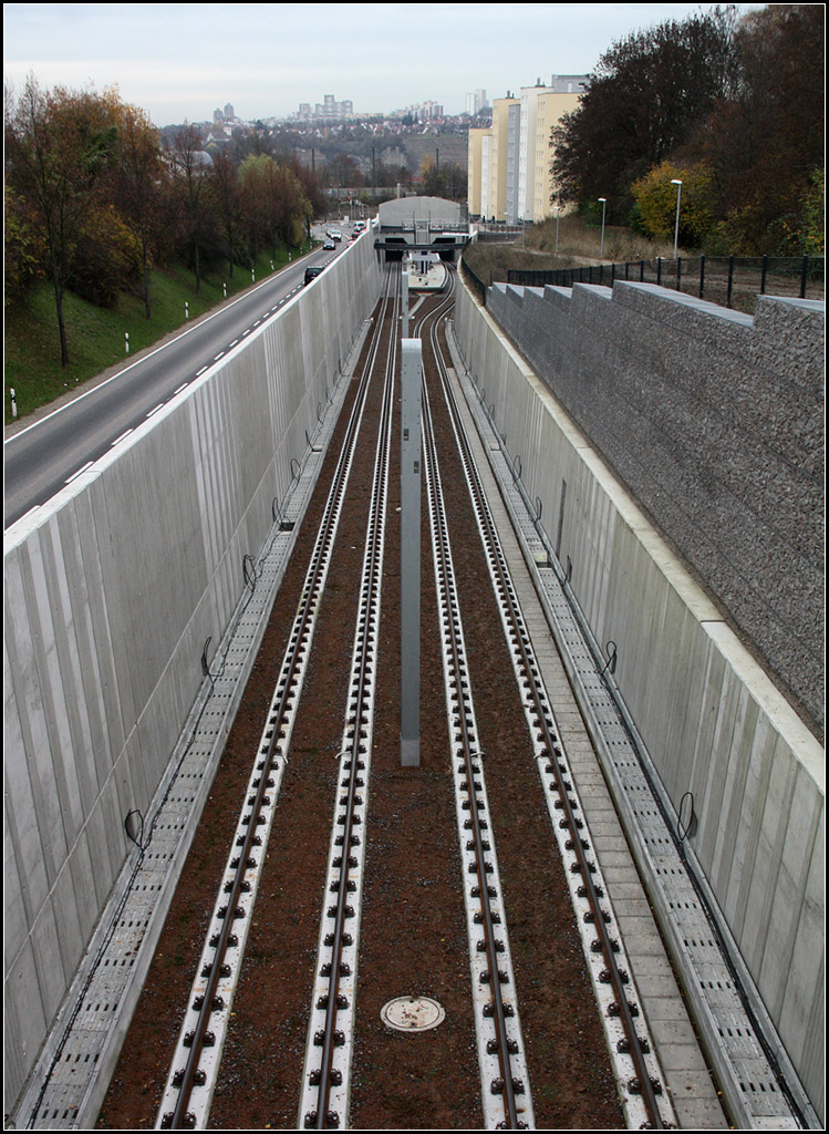 Nur auf die Verkehrsweg fokusiert bleibt natürlich wenig Grün im Bild. Das Vorstadtgebiet ist hier aber schon sehr durchgrünt, so dass es eigentlich schon gar nicht mehr urban wirkt. Die hier beim Bau der Straße gar nicht vorgesehene Stadtbahntrasse wurde in den bestehenden Lärmschutzwall eingebaut. Rechts außerhalb dem Bild liegt eine Schule und Wohnbebauung. Die Betonwand zwischen Straße und Bahntrasse hat sicher Lärmschutzfunktion. Gleichzeitig senkt sich die Stadtbahntrasse stärker ab, als die Straße, eigentlich eine durch das starke Gefälle sehr langgezogene Tunnelrampe. Theoretisch hätte man die Stadtbahn hier auch noch überdecken können, vielleicht auch mit seitlichen Öffnungen zu der Straße um dann oben drüber eine Grünfläche anzulegen. Aber das wäre sicher teurer geworden.