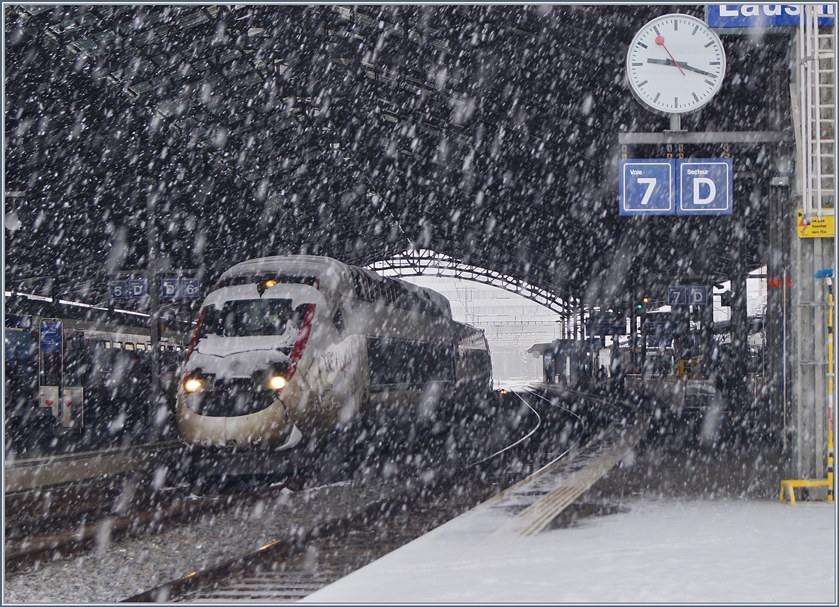 Der erste März, der Meteorologische Frühlingsanfang zeigt sich in Lausanne ziemlich winterlich: Der TGV Lyria 9264 wartet auf Gleis 6 auf die Abfahrt nach Paris. 1. März 2018 (zum Bild)