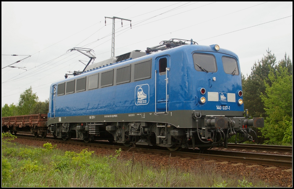 PRESS 140 037-1 mit Res-Wagen am 10.05.2012 in Berlin Wuhlheide. Einen Gruß an den Tf! (NVR-Nummer 91 80 6140 831-9 D-PRESS, ex DB 140 831-0) (zum Bild)