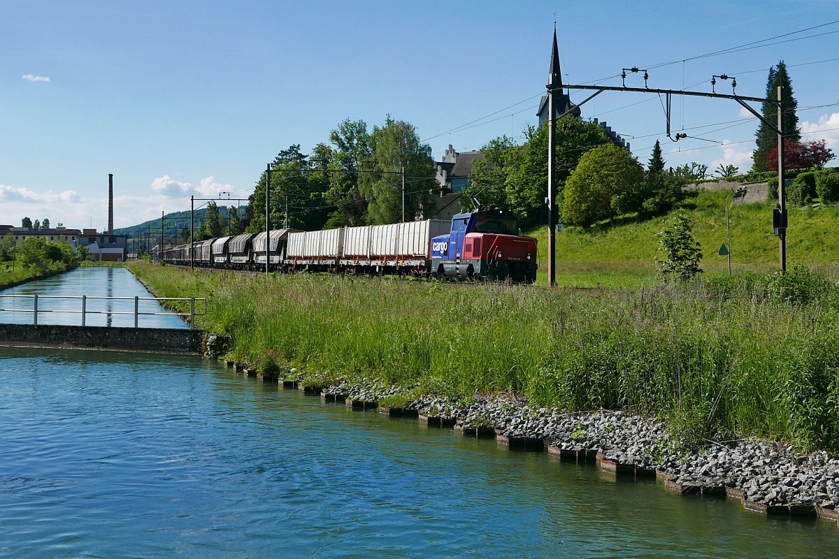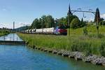 Aus Richtung Frauenfeld kommend zieht 923 018-8 'Frienisberg' einen gemischten Güterzug in Bürglen (TG) am Thurkanal entlang nach Sulgen (31.05.2019) (zum Bild)
