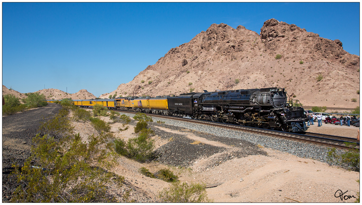 Union Pacific No 4014 Big Boy fährt bei den 150 Jahr Feierlichkeiten der Transkontinental Eisenbahn dem "The Great Race Across the Southwest" von Casa Grande nach Tucson. Picacho Peak 17 Oktober 2019 (zum Bild)