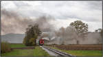 Tiefdruck und zahlreiche Wolken kündigten Schlechtwetter an . Mit Tiefdruckwetter verbunden sind die am Boden bleibenden Rauchwolken von 764.411 R . Der nebenbei wehende Wind hat für ein ganz anderes "Dampflok Spektakel geführt. 764.411 R mit dem Flascherlzug und MK48.2019 als Vorspann an diesem 3.November 2019 kurz vor Neudorf im Stainztal. (zum Bild)