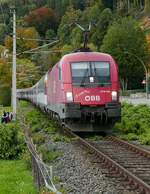 Zwischen Hörbranz und Bregenz hat 1016 007 'Sonny Boy' am 20.10.2019 die Wagen des IC 119 "BODENSEE", Lindau - Innsbruck, am Haken. (zum Bild)