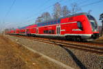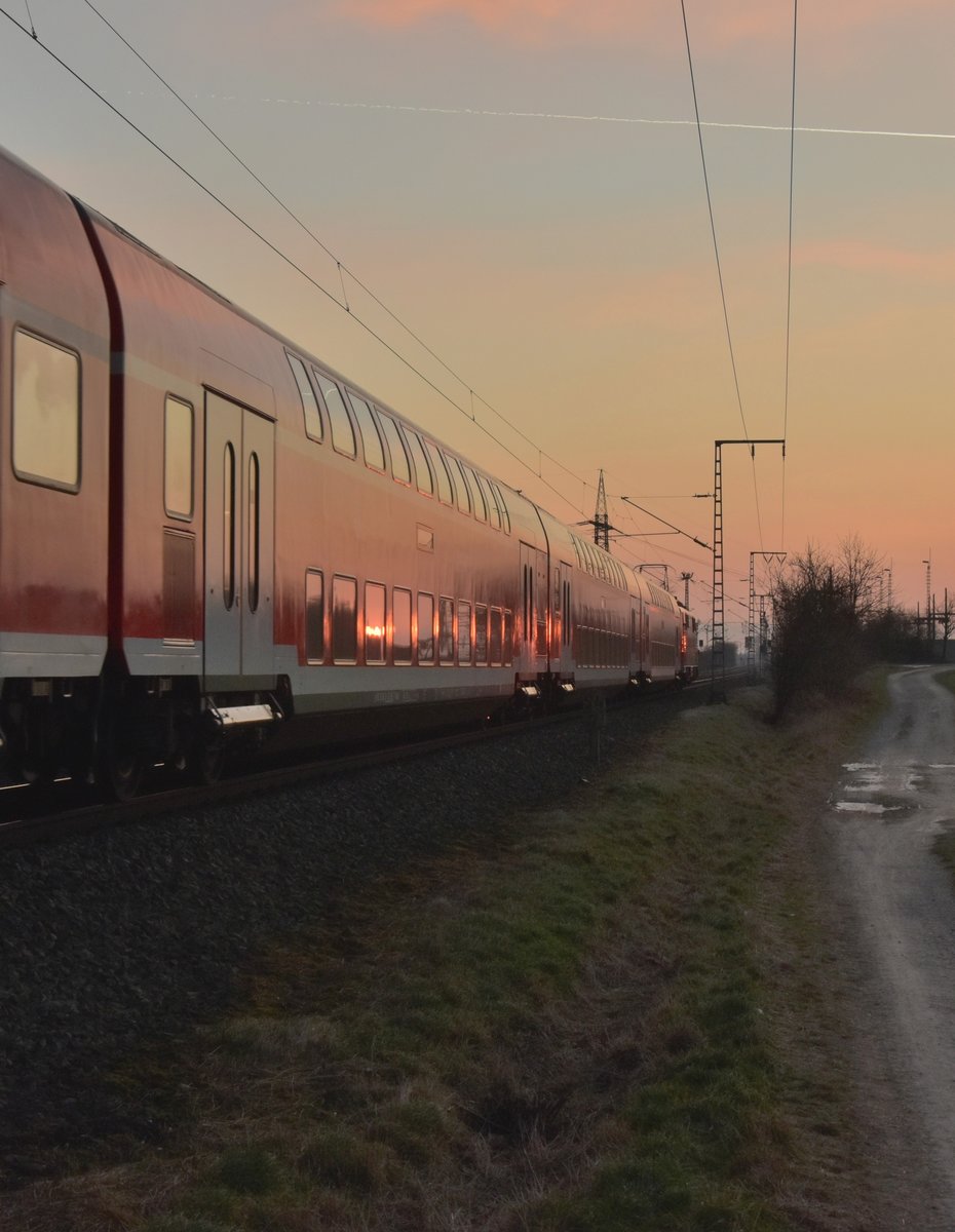 die Spiegelung des Sonnenuntergang in den Dostos und auch vorne an der Lok gefällt mir sehr. Auch insgesamt eine besondere Lichtstimmung, die das Verkehrsrot des Zuges anders erscheinen lässt, irgendwie wie in Metallic lackiert. Man könnte das Bild noch enger ausschneiden, rechts den Weg weg und dann auch unten entsprechend wegnehmen. Aber auch so sehr schöne Aufnahme!