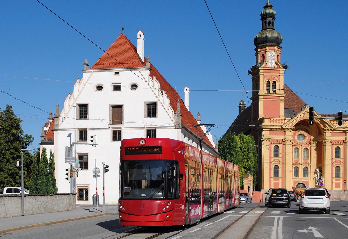 Tw.306 in der Pastorstraße auf der Fahrt ins Stadtzentrum, im Hintergrund erkennt man das Stift Wilten. (08.09.2020) (alla foto)
