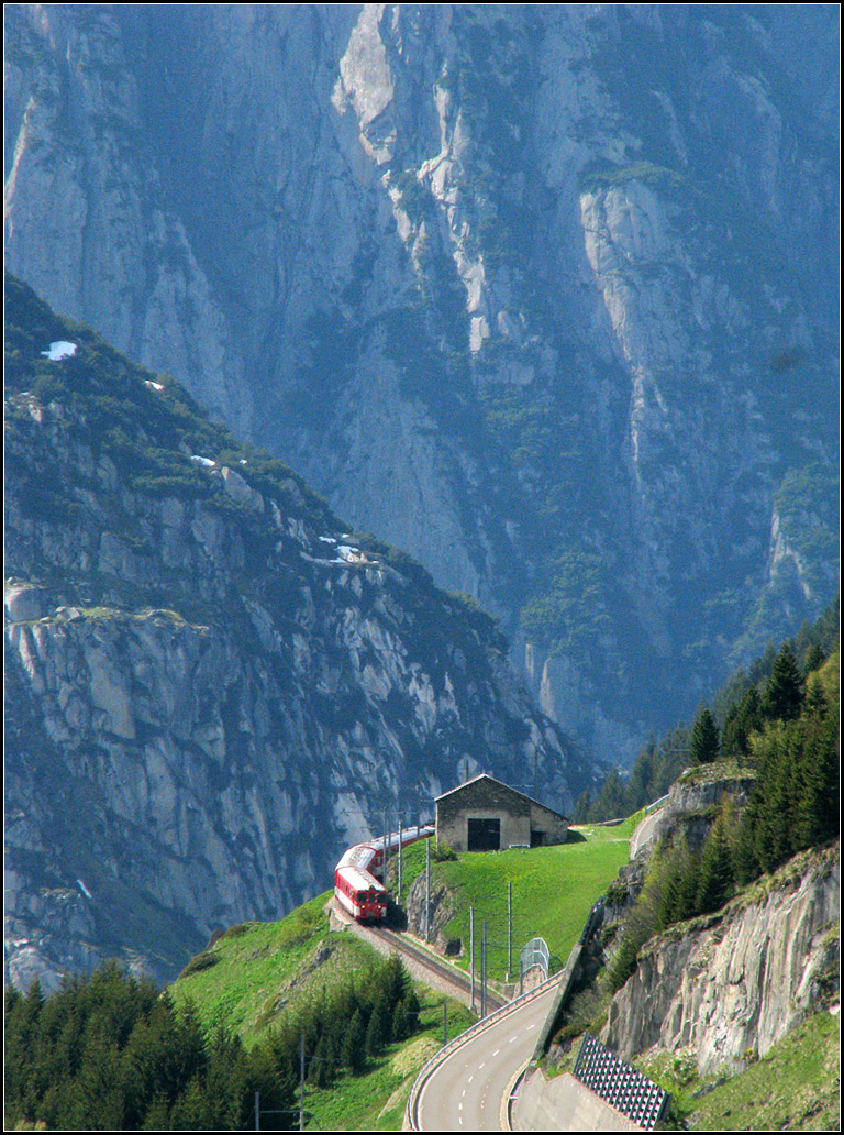 Die blaue Wand - Im Hintergrund die gewaltigen Felswände der Schöllenenschlucht. Der Zug befährt allerdings nicht die Strecke durch die Schlucht, sondern befindet sich auf dem Weg vom Oberalppass herunter nach Andermatt. 23.05.2008 (J) (zum Bild)