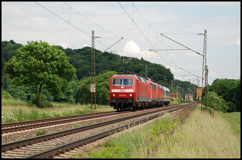 120 145 ist mit dem PbZ 2410 in Richtung Frankfurt unterwegs. Aufgenommen am 14.Juni 2008 bei Halzhausen. (zum Bild)