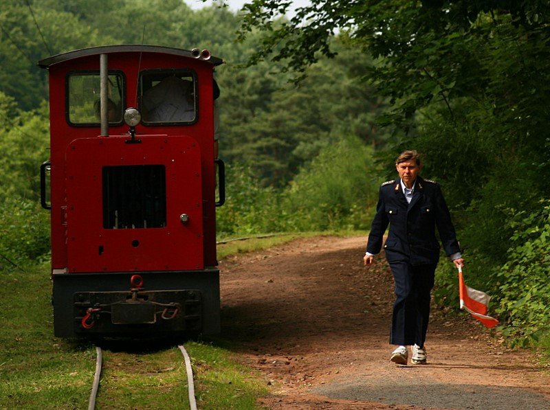 Der Schaffner sprang eben vom Züglein ab, um den Bahnübergang zum Eiswooger Bahnhof zu sichern. 15.06.08 (zum Bild)