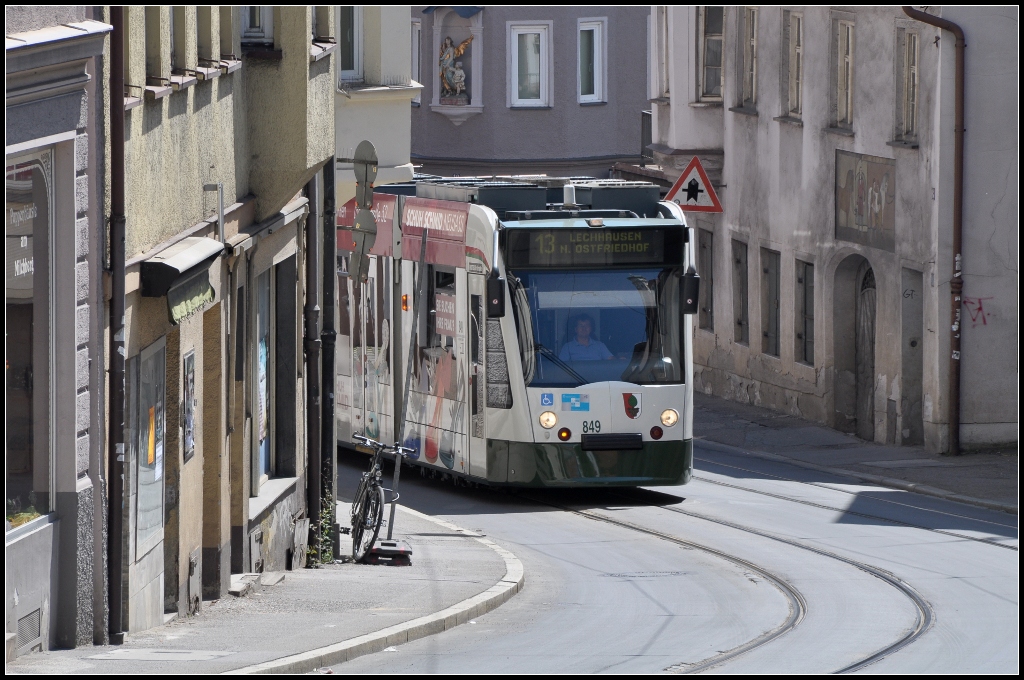 Eng und steil geht es zu - ... auf der derzeitigen Innenstadt-Umleitungsstrecke der Augsburger Straßenbahn am Milchberg. 26.05.2012 (J) (voir l'image)