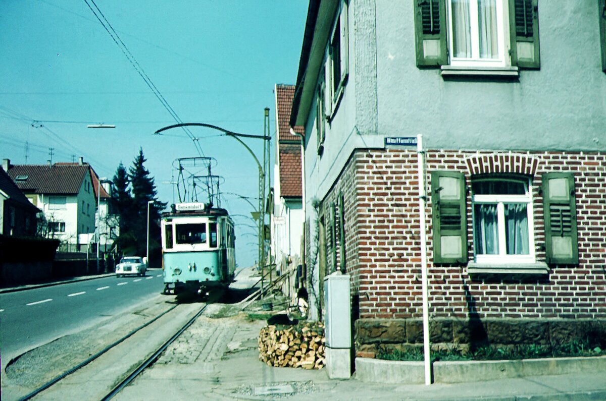 Tw 4 fährt hier bereits durch Denkendorf, kurz vor der Endstelle. Von rechts mündet die Neuffenstr. ein, das Haus mit der markanten Backsteinfassade steht heute noch.