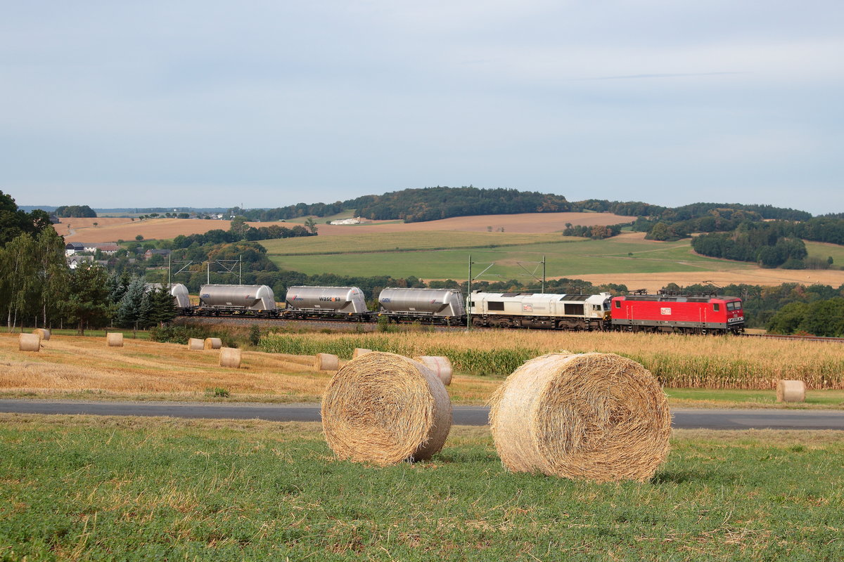 Zementleerzug aus Regensburg Hafen nach Rüdersdorf bei Berlin mit 143 und Class 66, Aufgenommen am 04.09.2016 (zum Bild)