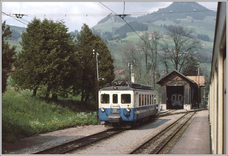Das Bild entstand m.M. nach in Chateau d'Oex. Die Remise ist mitlerweile abgebrochen und durch eine einfache Überdachung ohne Seitenwände ersezt worden. Der Tm 7 und der X1 stehen meist da abgestellt.