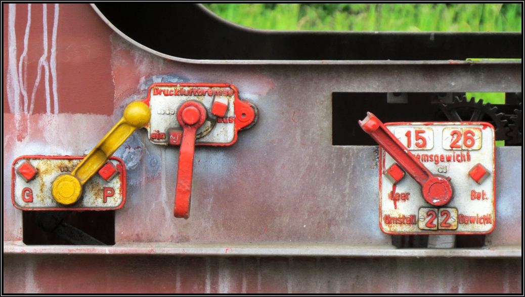 Verschiedene Bremshebel an einen Schüttgutwagen,gesehen und bildlich festgehalten am Güterbahnhof in Stolberg (Rhl),am 31.Mai 2015. (zum Bild)