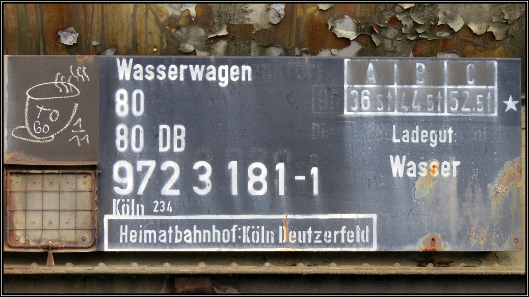 Wagenanschrift eines alten Kesselwagens ,abgestellt am alten Güterbahnhof in Stolberg (Rhl). Jetzt fehlt nur noch Kaffeepulver und ein Tauchsieder..und das Motto ..Coffee to go wäre umsetzbar. Momentaufnahme vom 31.Mau 2015. (zum Bild)