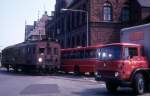 Helsingør: HHGB (Helsingør-Hornbæk-Gilleleje-Banen) am 5. Juli 1973: Die Diesellok M4 (Scandia 1933, ex-HHJ M4) hält mit einem Güterwagen mitten auf der Strasse (Jernbanevej) auf dem Verbindungsgleis zwischen der HHGB und dem DSB-Bahnhof Helsingør. Ein DSB-LKW sperrt für die Weiterfahrt. (zum Bild)