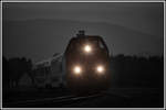 Zug und schneebedeckte Berge im selben zarten Abendlicht - das gefällt sehr gut.