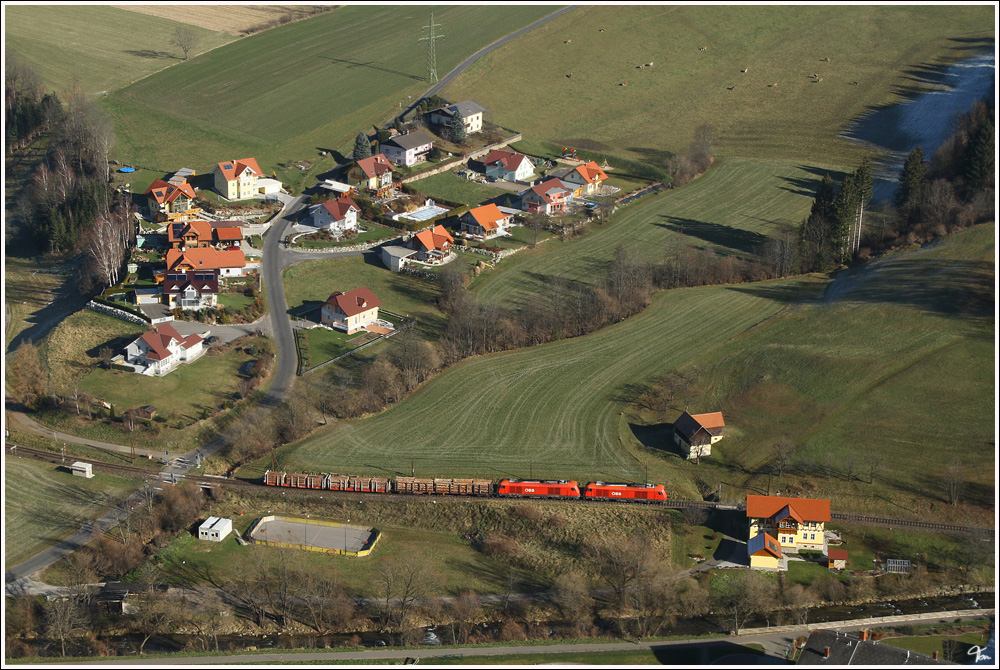 Eppenstein aus der Vogelperspektive - Ein 2016 Tandem fährt mit Güterzug 55557 von St.Michael nach Frantschach. 17.11.2011 (do obrazu)