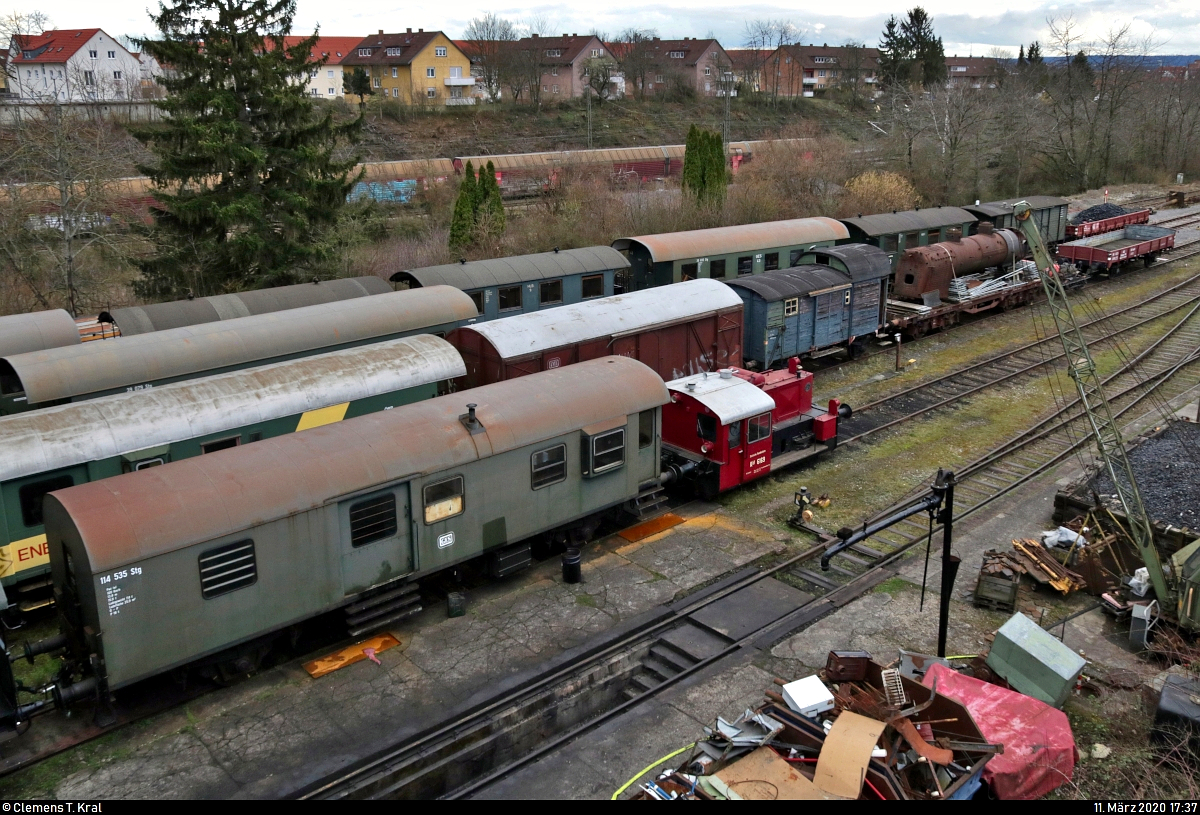 der 114 535 Stg im Vordergrund ist ein Packwagen (Gattung Pwi) und wurde von SGP 1960 gebaut. Die rote Kleinlok davor ist die Gmeinder Köf 6169. Vielleicht hilft es Dir für das Archiv.
