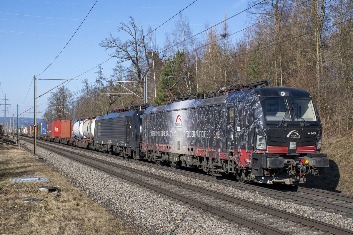 193 657 ist zusammen mit 189 986 in den Süden unterwegs, aufgenommen bei Brunegg AG (CH) am 13.02.2022. Liebe Grüsse zurück in die Lok und danke für den Gruss sowie allzeit gute Fahrt! (zum Bild)
