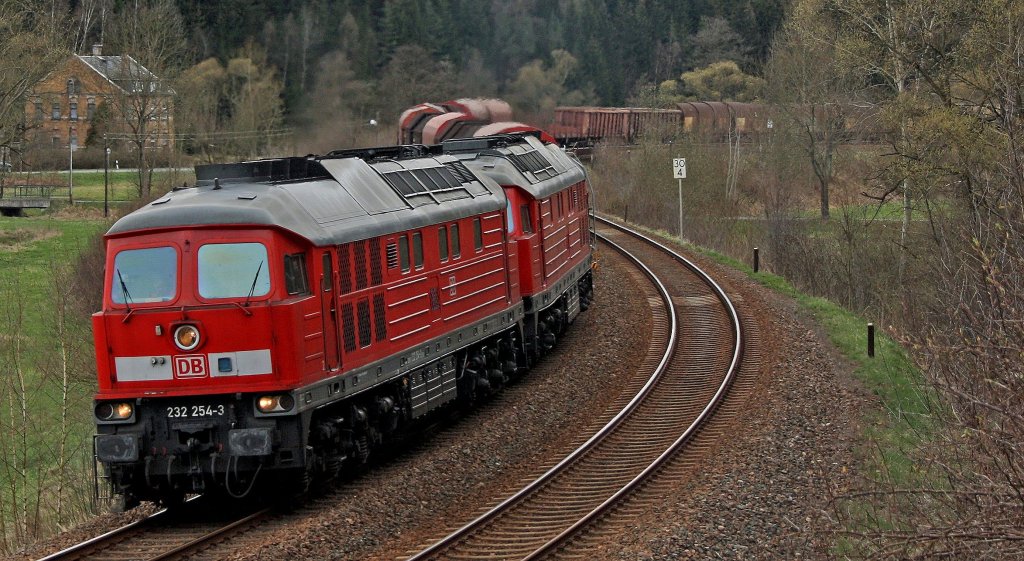 Güterverkehr im oberen Vogtland: 232 254 und 232 255 mit EZ95515 Engelsdorf - Nymburk (Elbtalumleiter) zwischen Hundsgrün und Adorf bei Leubetha, 21.04.2012. (zum Bild)