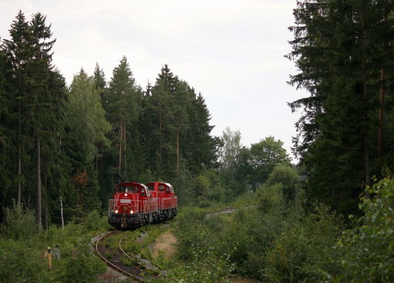 Güterverkehr im oberen Vogtland: 261 062 mit EK74831 Oelsnitz - Zwickau im obervogtländischen Wald zwischen Schöneck und Muldenberg, 08.08.2012. (zum Bild)