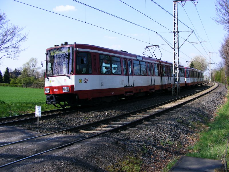 Eine Doppeltraktion aus Stadtbahnwagen B der Rheinbahn vor der Haltestelle in Düsseldorf-Froschenteich als Zug der Linie U79 nach Düsseldorf Hbf am 17. April 2008.(zum Bild)