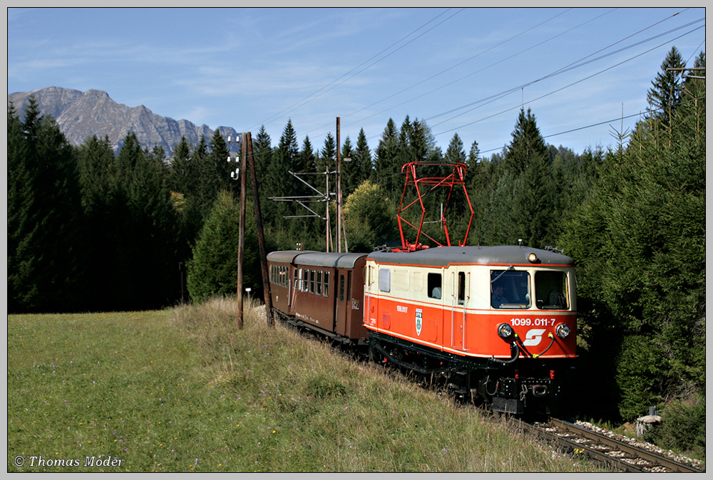1099.011 zieht den R 6811 durch Wiesen & Wälder und über Viadukte nach Mariazell, aufgenommen vor dem mächtigen Ötscher nahe der Haltestelle Erlaufklause. 03.10.2010 (zum Bild)