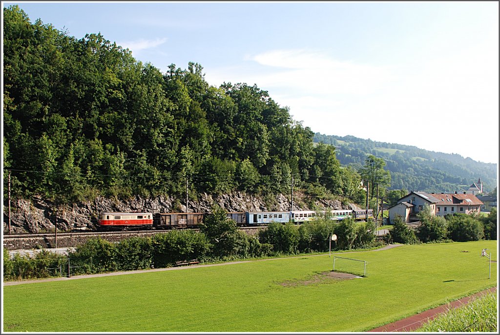 Am 8.August 2010 wurde der R 6805 überraschenderweise von der 1099.14 bespannt. Dieses Bild zeigt den Zug bei der Ausfahrt Frankenfels. (zum Bild)