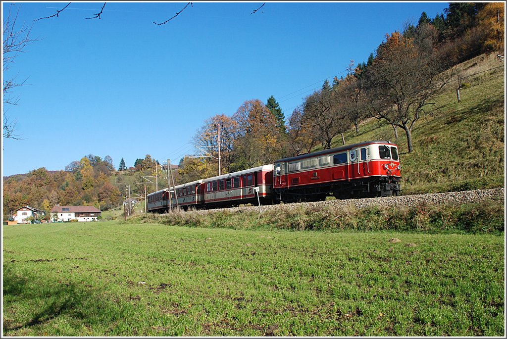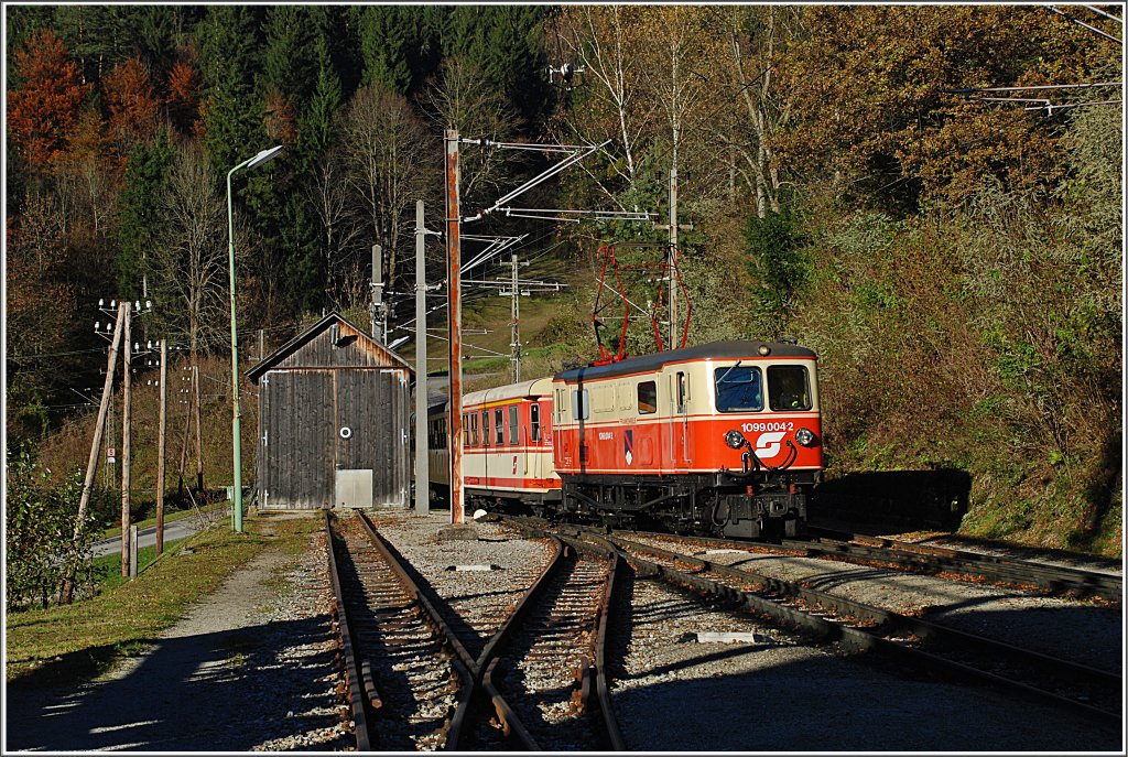 Da am 23.9.2010 kein 4090 in Betrieb war, wurde der R 6815 von der 1099 001 + 4x jaffa bespannt. Hier der Zug in den letzten Sonnenstrahlen kurz nach Kirchberg an der Pielach. (zum Bild)