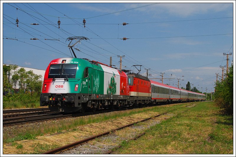 Nach den RailJet Probefahrten von Wien auf den Brenner, in weiterer Folge mit einer E 189 nach Bozen, und wieder retour nach Wien, ging 1216 004 am 9.5.2009 mit dem OEC 733 (Wien-Villach) wieder Richtung Süden. Die Aufnahme zeigt sie als Vorspannlok vor dem OEC 733 bei der 60ger LA kurz der S-Bahnstation Atzgersdorf-Mauer. (zum Bild)