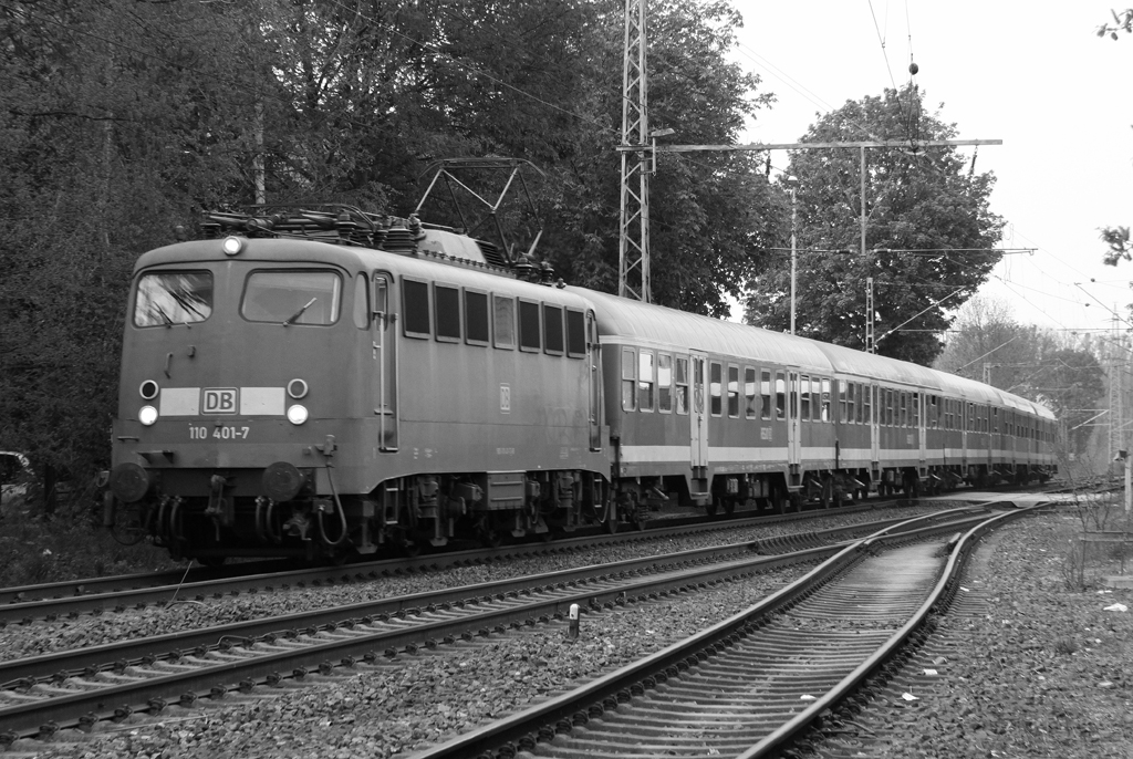 Ein Bild der Vergangenheit. Am 02.05.2013 zog 110 401-7 ihre letzte Stammleistung auf dem RE4 / 10457 von Düsseldorf nach Aachen in Geilenkirchen über den Bahnübergang, bereits einen Tag später wurde sie im Deutzerfeld abgestellt. R.I.P Bügelfalte 401 !!! (naar de afbeelding)