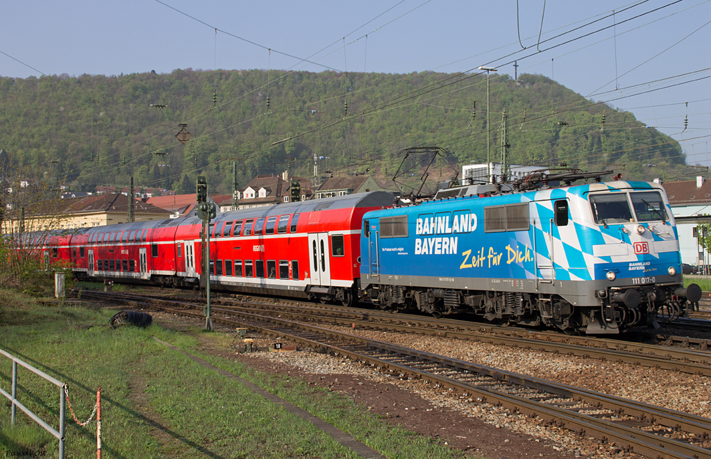 Wenn der Fotograf nicht zur Lok kommt, kommt die Lok eben zum Fotografen. Am 5. Mai 2013 bespannte die Münchner 111 017-0 einen Fußball-Sonderzug von Augsburg nach Freiburg. Bei der Durchfahrt von Geislingen (Steige) entstand diese Aufnahme. Der Auslösezeitpunkt war exakt so geplant! :-) (naar de afbeelding)